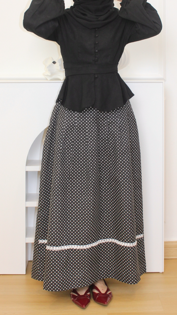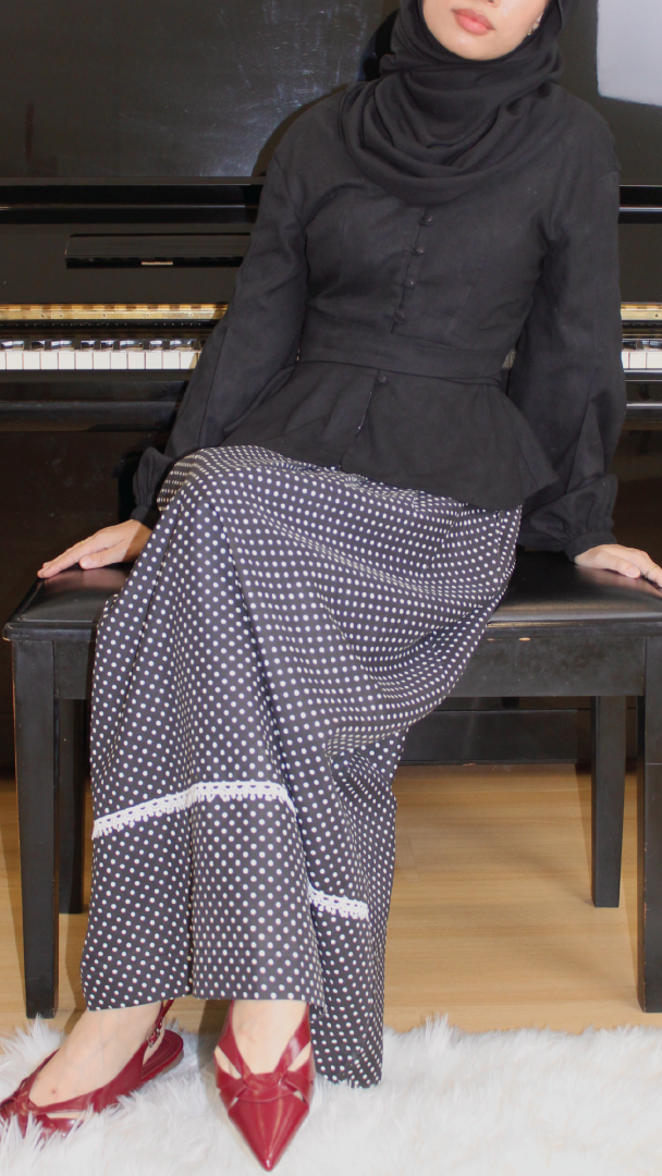 A voluminous high-waisted flare skirt reimagined in vintage polka dots & lace, designed to make you feel like you’re in a dreamy summer romance. Can be worn two ways, front or back, for endless possibilities.